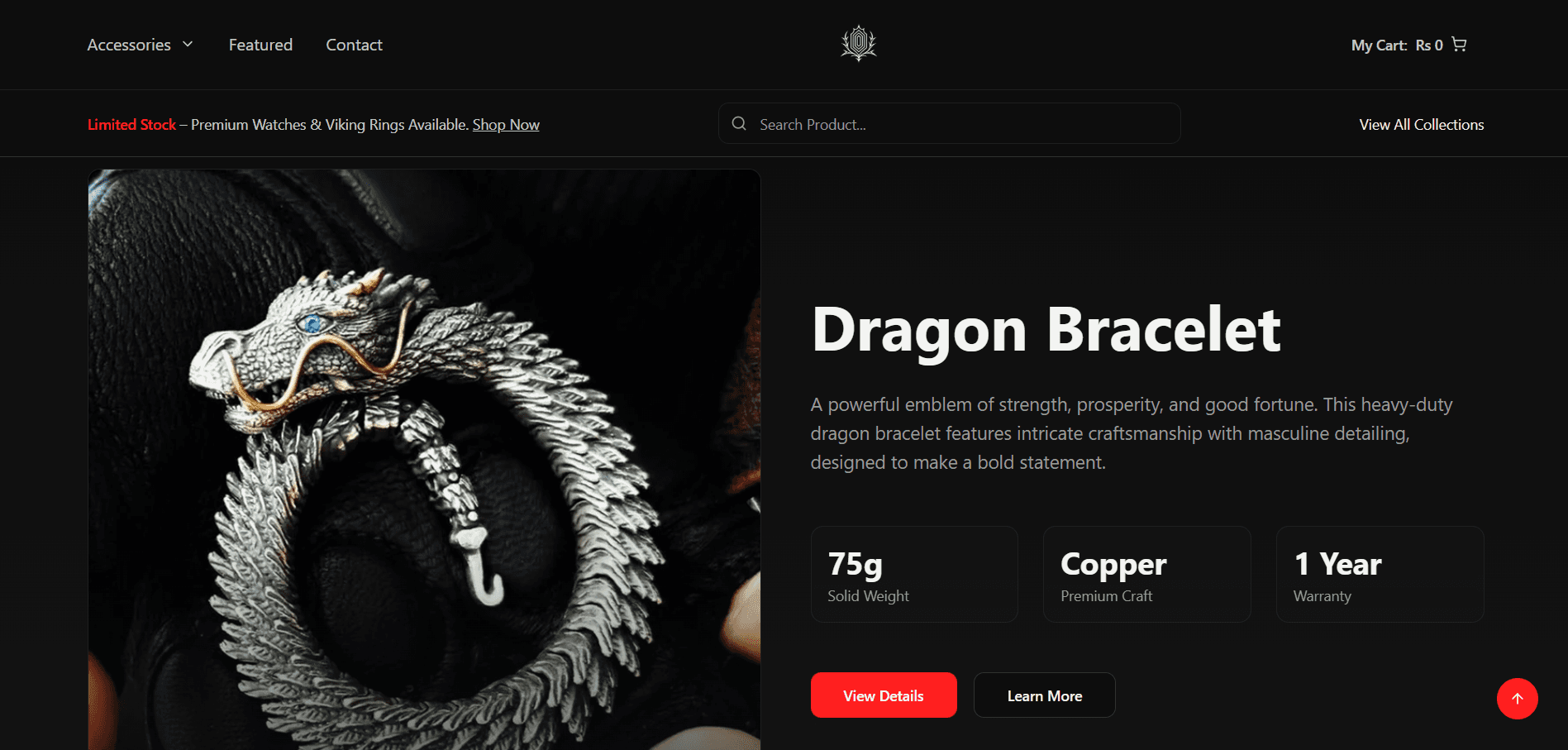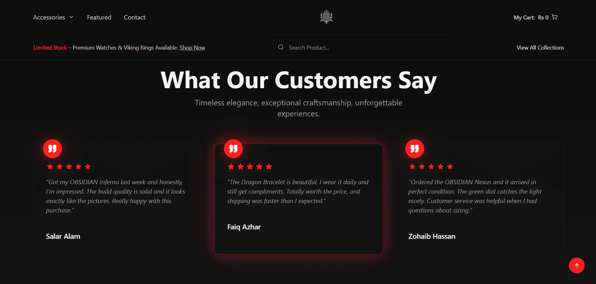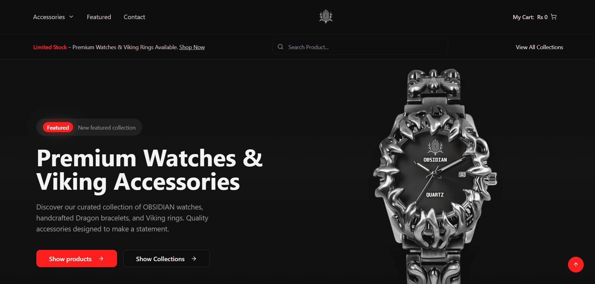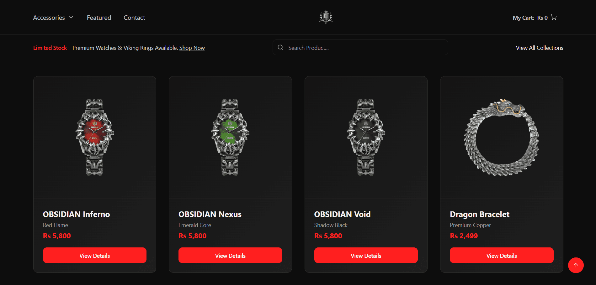 The goal of this project was to build an accessories store that blends visual sophistication with practical usability. Watches, bracelets, and rings require a clean and expressive showcase, and Obsidian Vaults delivers that through purposeful design choices.